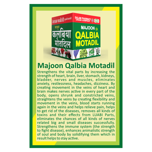 Qalbia Motadil 150gm Majoon: Activates nerves and veins in the heart, brain, muscles, and body, helping eliminate heart and lung diseases.